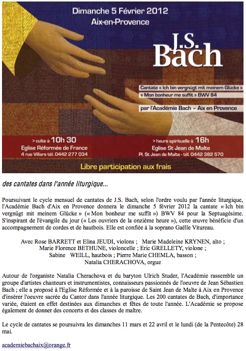 l’Académie Bach d’Aix en Provence donnera le dimanche 5 février 2012 la cantate « Ich bin